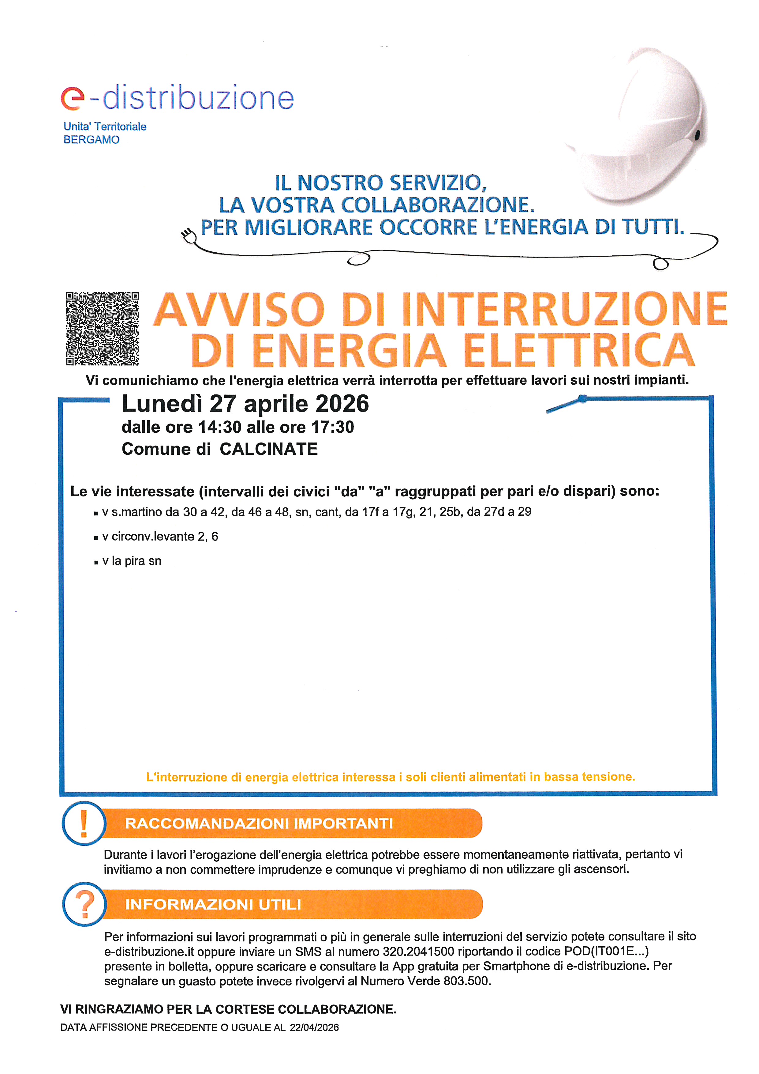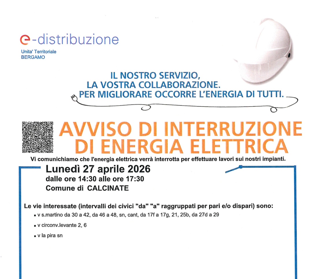 Si informa la cittadinanza che lunedì 27 aprile 2026, dalle ore 14:30 alle 17:30, è prevista un’interruzione dell’energia elettrica nel Comune di Calcinate per lavori sugli impianti.