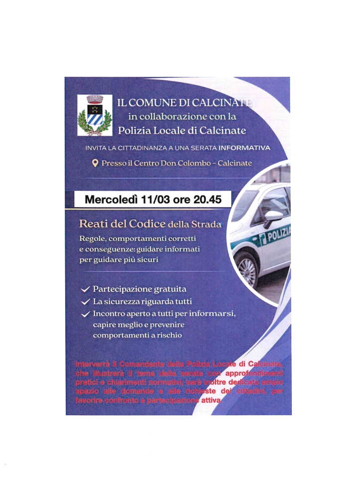 Il Comune di Calcinate, in collaborazione con la Polizia Locale di Calcinate, invita la cittadinanza a partecipare a una serata informativa dedicata ai reati previsti dal Codice della Strada, alle regole di comportamento e alle principali conseguenze legate alle violazioni.