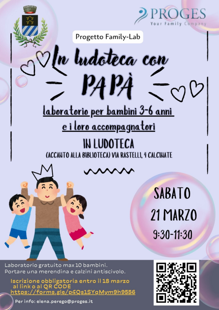 Nell’ambito del Progetto Family-Lab, la ludoteca comunale di Calcinate propone “In Ludoteca con Papà”, un laboratorio dedicato ai bambini e alle bambine dai 3 ai 6 anni, accompagnati da un genitore o adulto di riferimento.