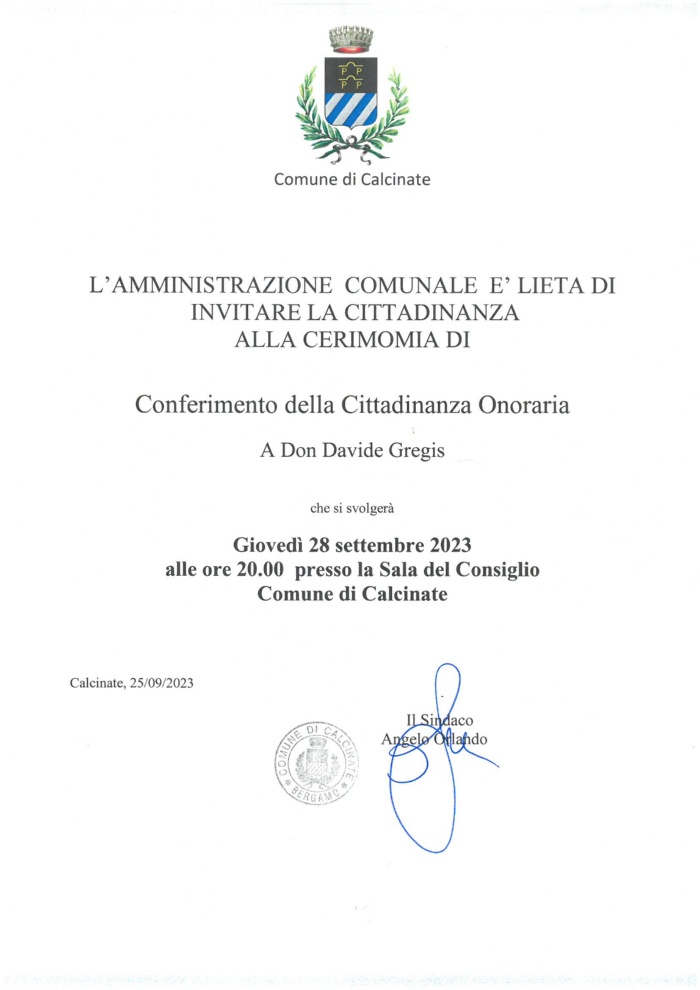 Cerimonia conferimento Cittadinanza Onoraria a Don Davide